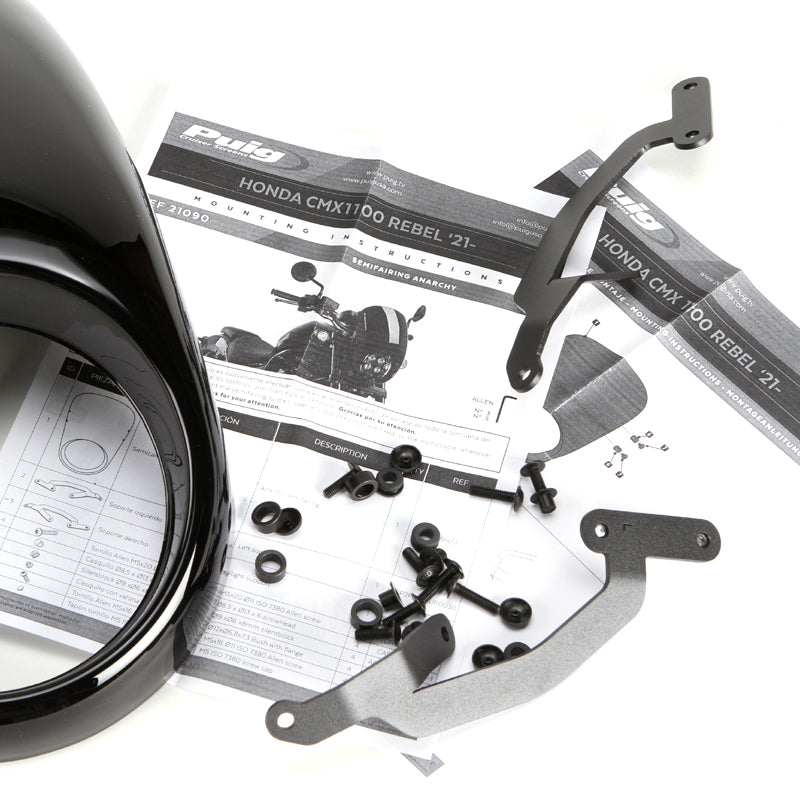 ABS製ワンピース構造のセミフェアリングです。車種専用のステーを付属し、ボルトオンにて取り付けが可能。車種専用設計ならではのフィッテイングが、車両との一体感を演出いたします。