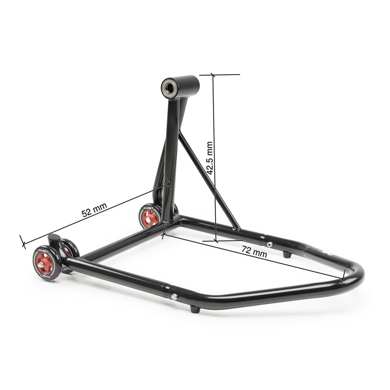 シングルスイングアーム(右側)用リヤスタンドに、専用のアダプターを付属。アダプター部分にベアリングを用いる事で、スムーズなリフトアップを実現。組み立て式の為、車載時等、コンパクトに収納が可能。エポキシコーティング塗装。別売の別車両用アダプターを用いる事で、他のシングルスイングアーム車両にも対応可能。