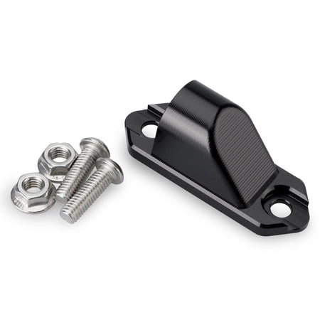 社外製ミラーの取り付けを可能にするアルミブロックから削り出したミラーアダプター。